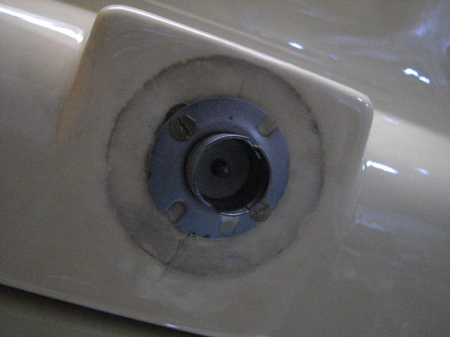 Dann einen dünnen Spachtel zwischen Abdeckung und ABS „Waschraumtiefziehteil“ und mit dem Schraubenzieher vorsichtig die Abdeckung Stückchen für Stückchen, immer mit dem Spachtel als Schutz darunter, rundherum nach unten abhebeln.