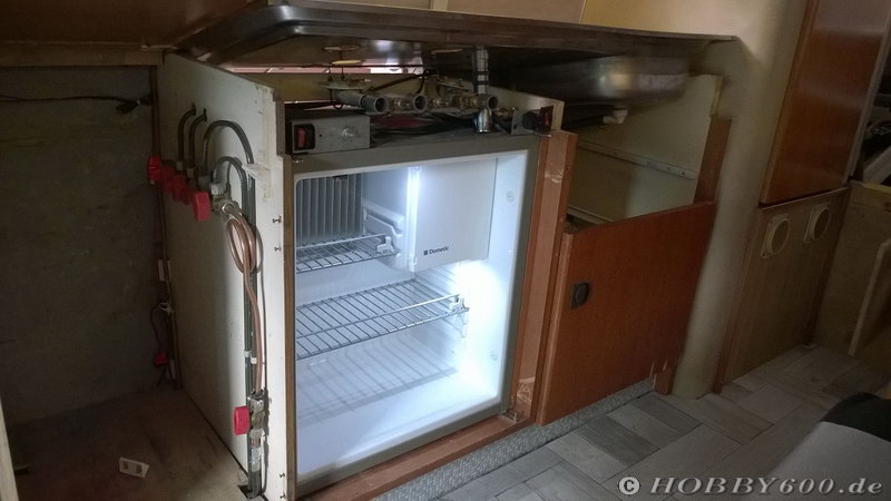 Wir fanden die links angeschlagene Kühlschranktür immer sehr unpraktisch. Ich habe schon mal versucht der Tür zu drehen, aber wegen der dicken Frontverkleidung passt sie beim Öffnen nicht in den Raum zwischen Kühlschrank und rechter Schublade. Links ist zwischen Kühlschrank und Gasschrank dafür extra eine Spalte von 20mm.
