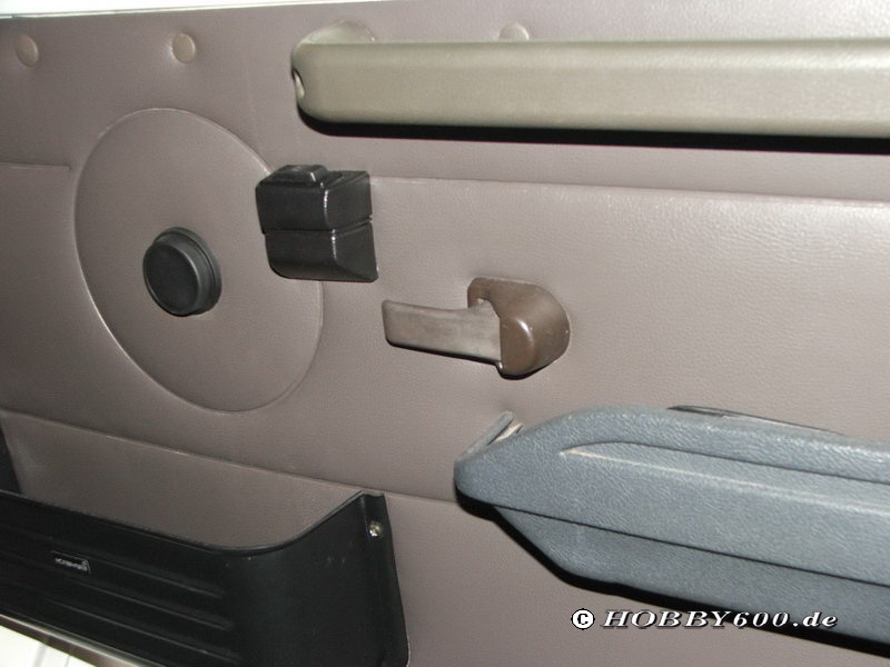 Nun müssen an den Türverkleidungen an geeigneter Stelle Ausschnitte für die Schalter eingebracht werden. Mit Hilfe der beiliegenden Schablonen werden die Öffnungen angezeichnet und dann mit einer Stichsäge ausgeschnitten. Bei dieser Gelegenheit muss die Bohrung für die Original- Fensterkurbel erweitert werden. Die Abdeckung für die Kurbel ist etwas größer, weil hier gleichzeitig die Notbetätigung angesetzt werden kann.