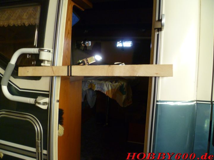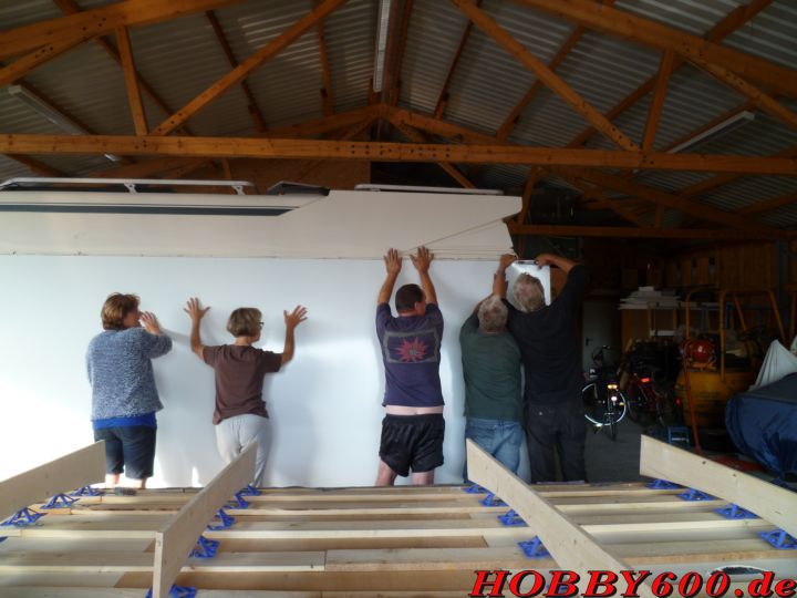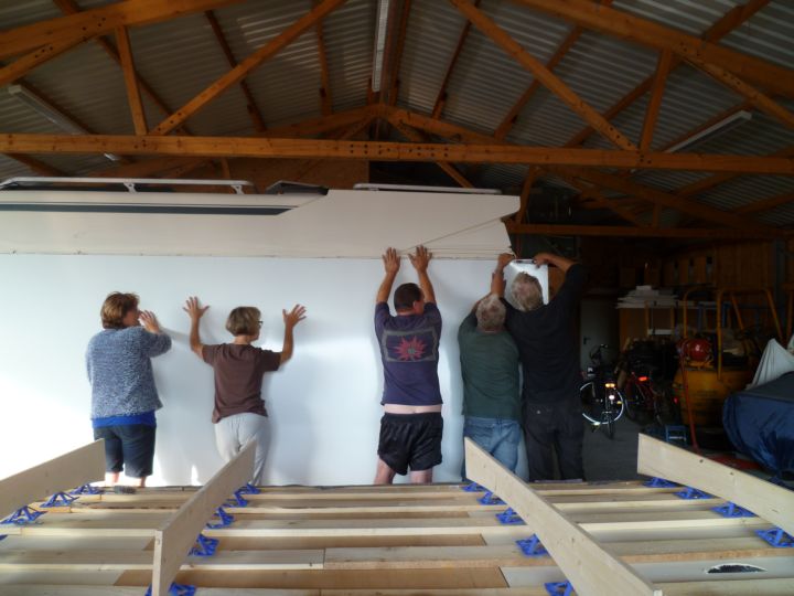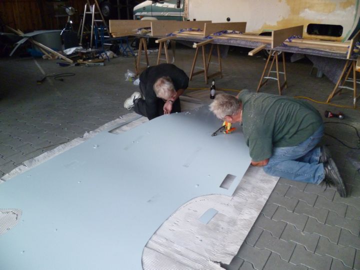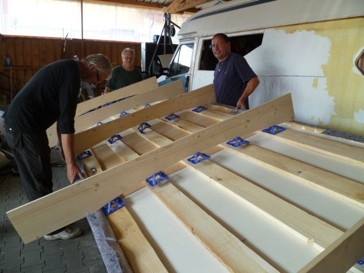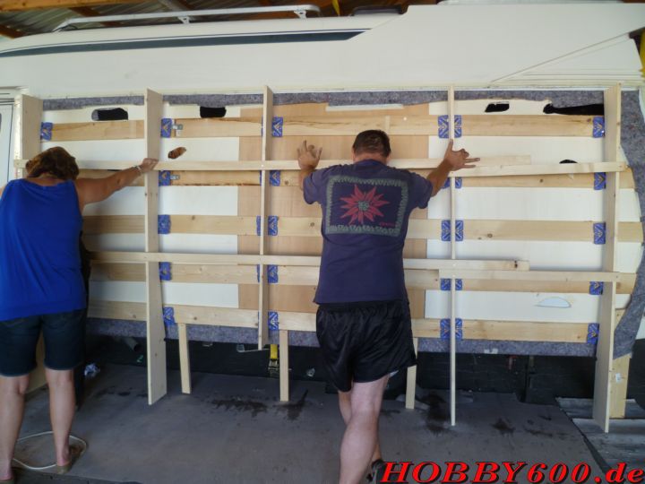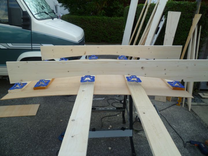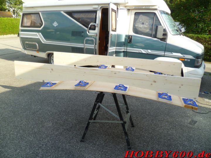Unser Mobil hat im Unterschied zu den meisten Wohnmobilen keine geraden Außenwände sondern weist eine starke Wölbung aus. Dies macht zur flächendeckenden Anpressung eine Konstruktion erforderlich, die ähnlich einer Schalung ausgelegt ist, aber eine gleichmäßige Verteilung des Anpressdruckes gewährleistet.