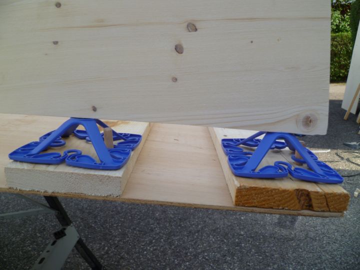 Jetzt wurde die Anpresskonstruktion zusammengebaut und zunächst die Sperrholzplatten zum Schutze des Bleches mit Malervlies bezogen. An den Positionen der Fenster wurden Ausschnitte zum Anbringen von Schraubzwingen eingebracht.