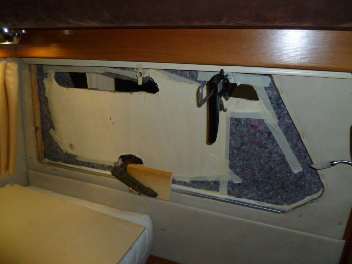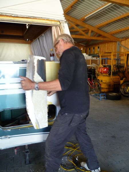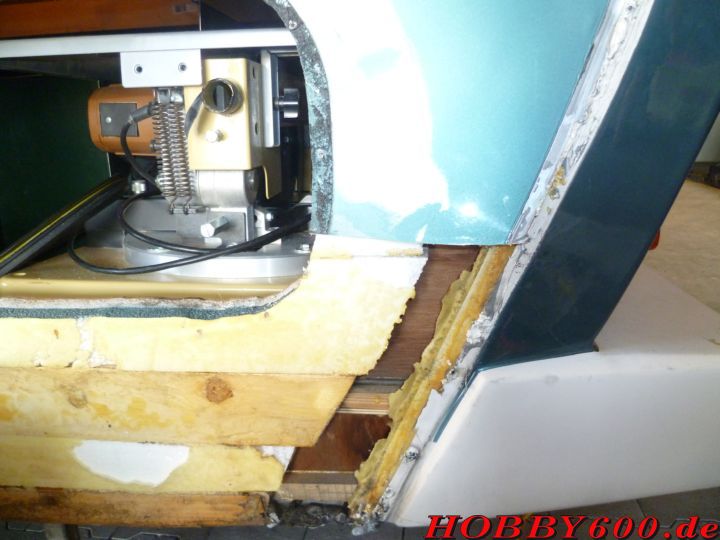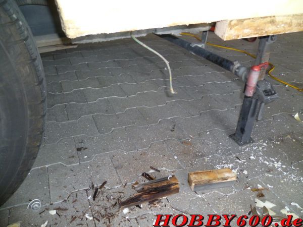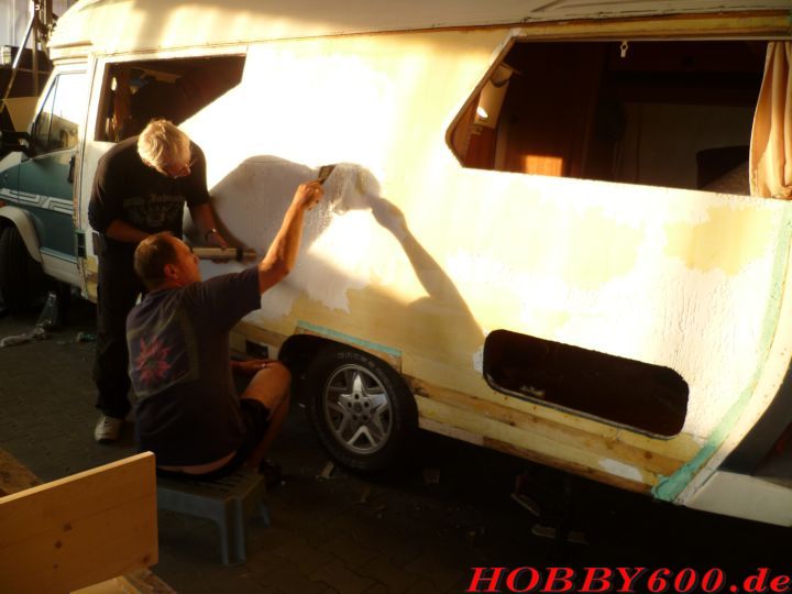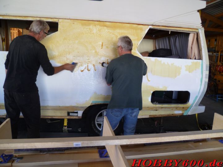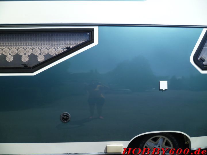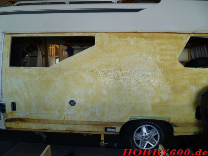 Im Laufe der Jahre haben sich bei meinem Hobby 600 großflächige Ablösungen des Außenbleches an der linken Seitenwand gezeigt. Ein Schadensbild, das auch bei anderen Fahrzeugen der Baujahre 1993-94 – besonders bei Sonneneinstrahlung - häufig auftritt. Hierbei löst sich die Verklebung der Sandwichplatte. Durch stellenweise Dehnungen des Bleches konnte ein nachträgliches Verkleben durch Injektion an diesen Stellen nicht durchgeführt werden.