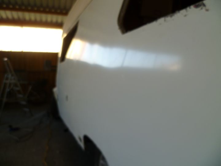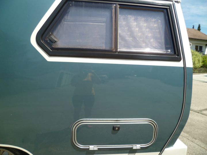 Gespannt entfernten wir am nächsten Tag die Andruckvorrichtung und waren sehr erfreut, dass alles glatt und kaum wellig war (Bild 25). Während das Fahrzeug zum Lackierer gebracht wurde, hatten Zeit, die Türe zu reparieren und sämtliche Leisten zu säubern bzw. die lackierten Leisten abzubeizen. Die meistem Gummileisten konnten wir neu kaufen. Erst 5 Tage später konnten wir das Mobil vom Lackierer holen. Wir waren begeistert.
