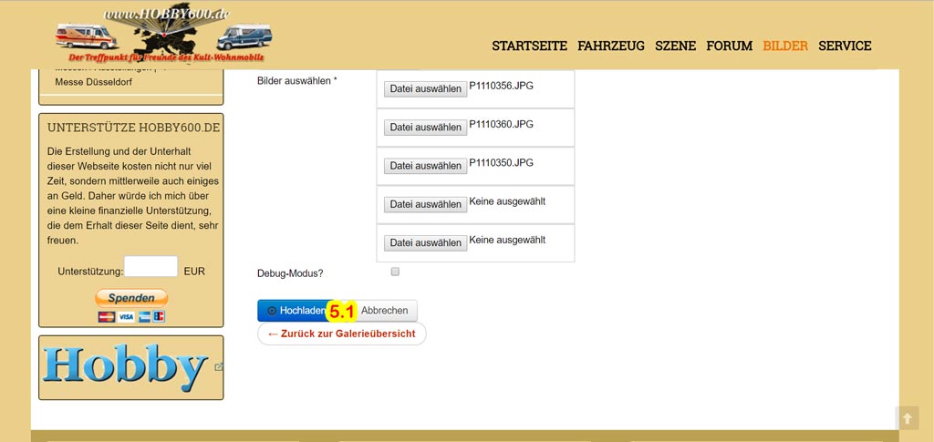 So werden nacheinander die gewünschten Bilder eingetragen. Zum Schluss betätigt man den Button <Hochladen> (5.1) und fertig ist.