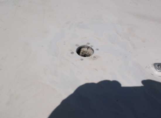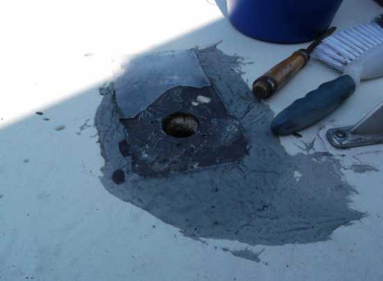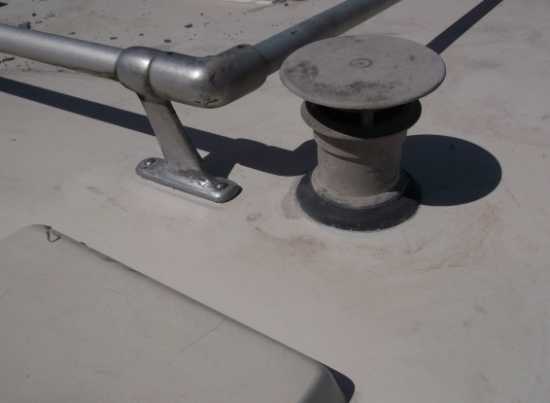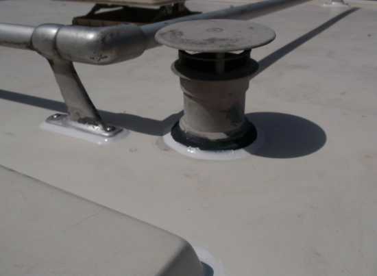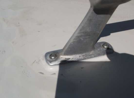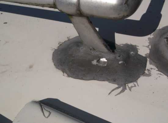 Hier war wahrscheinlich mal ein Antennenmast drinnen. Irgendeinen Verpackungsdeckel draufgetan und mit GFK Pampe verschmiert. Anders kann man das wohl nicht nennen. Ist ohnbe Zerstörung der Oberfläche garnicht mehr zu entfernen. Der nette Pfuscher hatte von Scherkräften, die auf starre Materialien wirken wohl noch nie was gehört.
