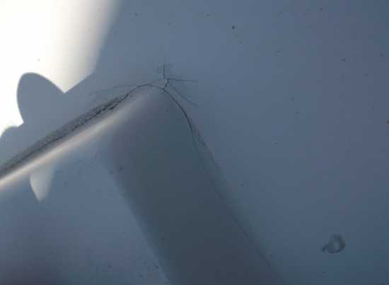 Entlang des Daches Haarrisse, in die Wasser eindringen kann. Mit Silikon verschmiert. Haftung = 0.