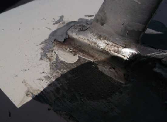 Der bestellte Lüftermotor passt leider nicht,das Wetter ist bombastisch, also mache ich mich an die Undichtigkeiten am Dach. Hier wurde großflächig GFK "Pampe" draufgeschmiert. Wie dämlich!