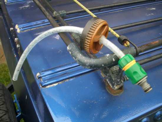 ich stecke einfach den Schlauch, an dessen Ende ein Gardena-Kupplungsstück ist, in den Tankstutzen. Das klemmt fest im Stutzen und wenn der Tank voll ist, läufts über den Überlauf und Einfüllstutzen raus. Nix gebastelt und funzt gut (ist noch nie rausgerutscht)