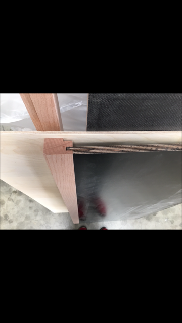 Und es gibt das Brett was mit der Außenhaut verbunden wird mit Caravan-Kleber. Dieses Brett wurde außen extra vom Schreiner so bearbeitet, dass der Kleber optimal hält (Beschichtung komplett weg). In dem "Außenbrett" sind jeweils auch Nut-Verbindungen eingefräst und die Siebdruckplatte sowie die Sperrholzplatte wird jeweils noch eingeklebt in die Verbindung.