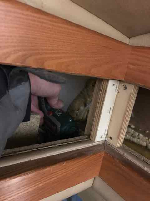 Dann ging es an´s Schrauben suchen. Zuerst die alte Glaswolle entfernen. Oben ist die Konsole mit jeweils 3 Schrauben seitlich und 3 Schrauben auf der Längsseite durch die obere innere Leiste in die Deckenpaneele geschraubt. Unten sind jeweils re, li und vorne eine Senkschraube (10mm), die durch´s Holz, GFK Dach, und Ducato Blechdach geht.