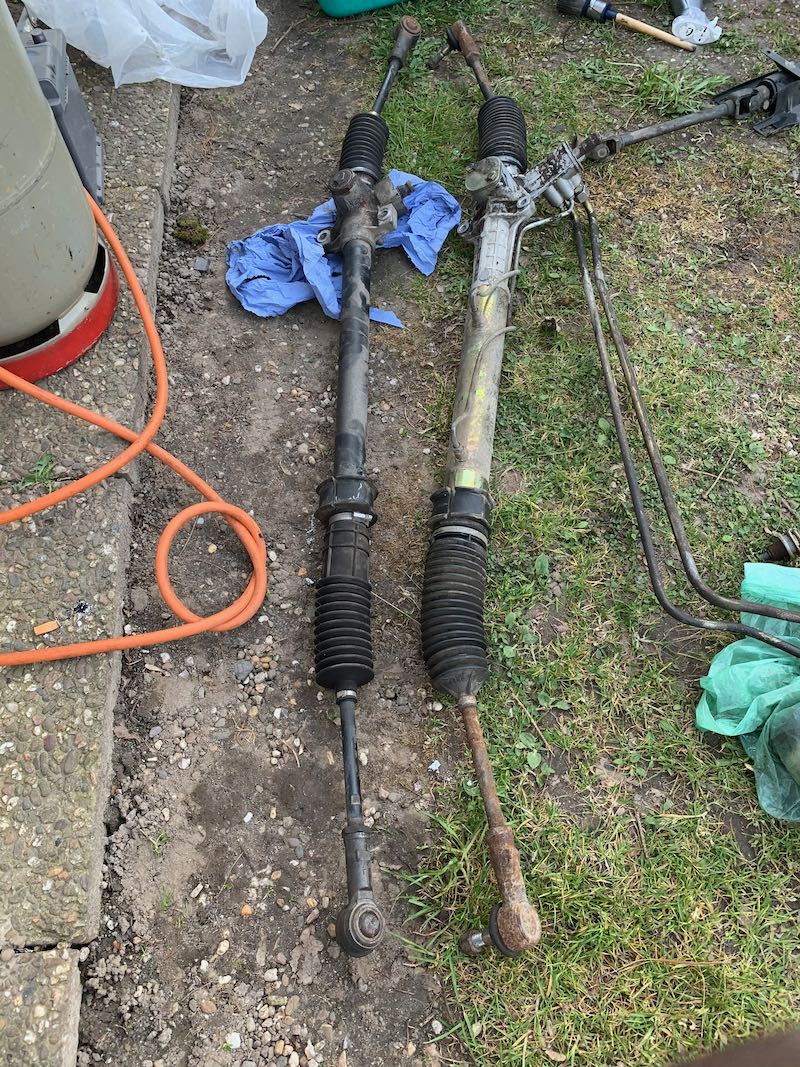 Also Tankbefüllrohr und Entlüftungen ausbauen (Ist auch besser, um die Innenkotflügel zu konservieren), Auspuff abbauen, Getriebehalter und einiges mehr ausbauen. Ob es dann klappt, weiss ich noch nicht, denn: Ich habe dann bemerkt, das im Faltenbalg links ATF Öl ist, also undicht. So n halbes Schnapsglas.. Mist, also entweder alles fertig einbauen und gucken, wie es sich entwickelt, oder nach nem AT Lenkgetriebe gucken, damit man nicht nochmal alles ausbauen muß. Lenkgetriebe bei Axel Augustin 1000€ im Austausch. Unsere Zulieferhändler konnten nicht liefern auf unbestimmte Zeit und waren ungefähr bei der Hälfte. Dann im Internet recherchiert und eins gefunden für 269€ bei Bandel Automobiltechik. Ich hoffe das kann was, ist bestellt.