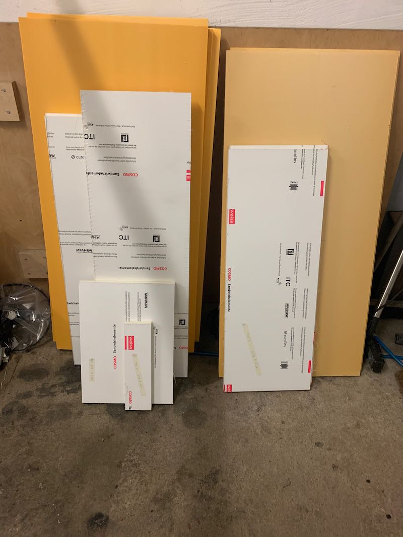 Nach den Platten habe ich lange gesucht.. Erst dachte ich an Sandwichplatten aus Alu aus dem Hallen oder Kühlbau. Die gibts aber erst ab 4cm dicke. Dann würde der Kühlraum zu klein werden, da ich ihn ja einschieben muss.