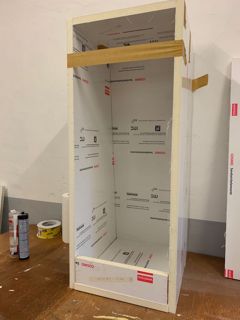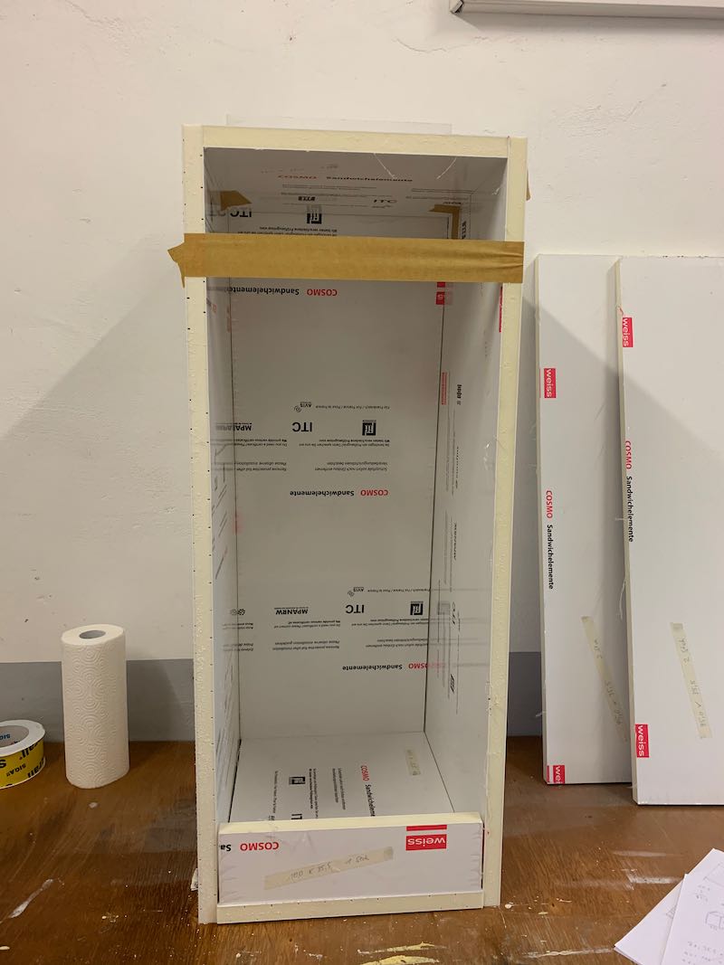 Mir ist klar, daß es nicht sehr effizient ist, den Kühlschrank über der Heizung zu platzieren. Die Heizung hatten wir aber erst 2 Mal an.. Und wenn man mal heizen möchte, nutzten wir die Kühlbox. Der Kamin wird Abgeschirmt und Luftkänäle eingebaut, um aufsteigende Hitze abzuleiten. Den Hochschrank möchte ich dafür nicht ausbauen und das ganze muss ja auch irgendwie Ausbaubar sein, falls mal irgendwas ist (am Kühlschrank oder Außenwand). Also wird der Kühli so gebaut, daß man ihn in die Öffnung des Hochschranks einschieben kann, ohne den Schrank zu verändern. In den Schrank kommt nur zusätzliche Dämmung, weil der Kühlschrank aus PVC Beschichteten Sandwichplatten in 2,5 cm Dicke gebaut wird. Das wäre zu wenig Isolierung.
