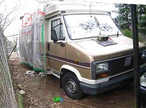 das Fahrzeug steht geneigt in Fahrtrichtung und an der Stelle ist nichts außer dem Schornstein (Abgasrohr der Heizung).
