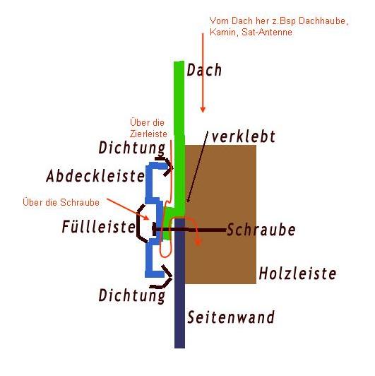 also für mich gibt es nur drei Möglichkeiten wo Wasser im Dach herkommen kann, die erste ist die naheliegenste, von Öffnungen im Dach, also Dachhauben etc., die zweite wäre über die Schrauben der Abschlussleiste, wenn sie schlecht abgedichtet sind und als letzte Möglichkeit wäre angesammeltes Wasser im unteren Teil der Abschlussleiste, das dann zwischen Wand und Dach hochsteigt, da das Dach die Wand überlappt kann es ja nur von unten nach oben gelangen. Ich glaube ein wunder Punkt an den Abschlussleisten sind die Kappen am jeweiligen Ende der Leisten, wenn das Fahrzeug schräg steht, dann kann das Wasser an schlecht abgedichteten Kappen in die Leiste laufen und sich dort sammeln, wie seht Ihr das?