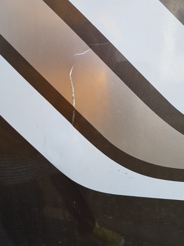 Zum Riss: Sieh zu, dass Dir jemand die Folie erstellen kann. Dann alte Folie runter, Lack ausbessern und neue Folie drauf.