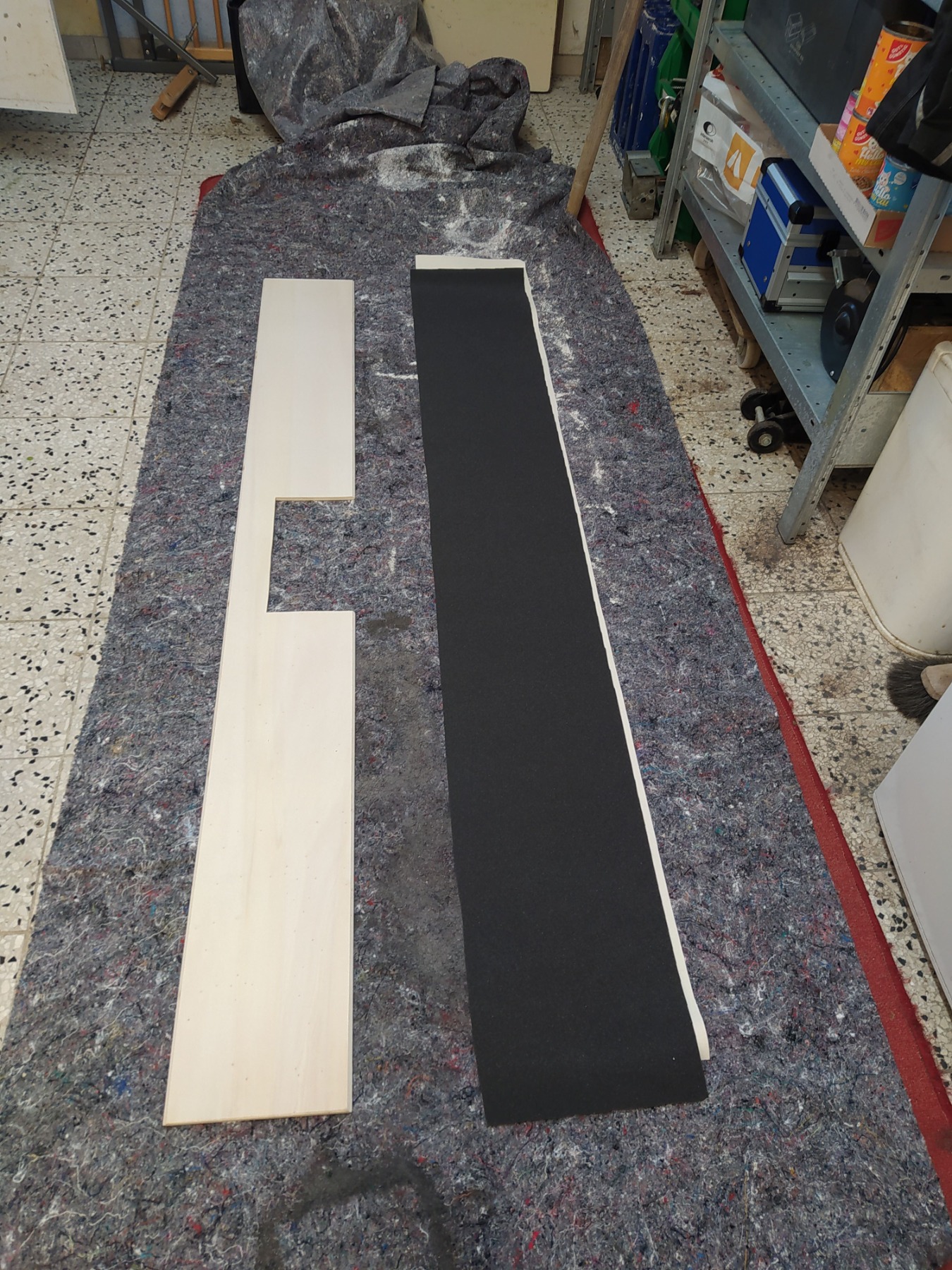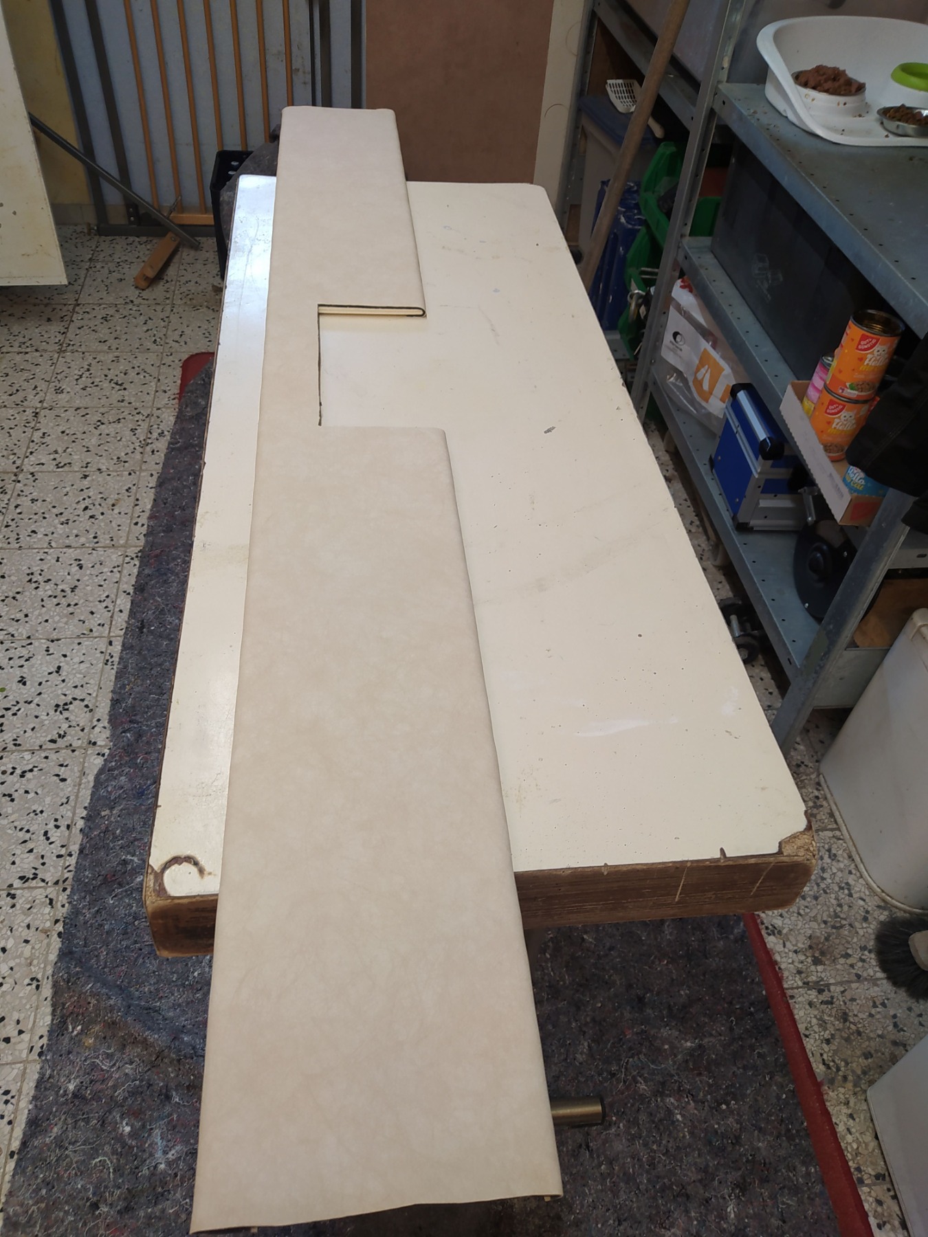 Zuerst haben wir den Ausschnitt für das Dachfenster in das Sperrholzbrett geschnitten. Wir waren der Ansicht, dass das vor dem Beziehen einfacher ist. Das zweite Brett hatte ich schon vor ein paar Tagen bezogen.