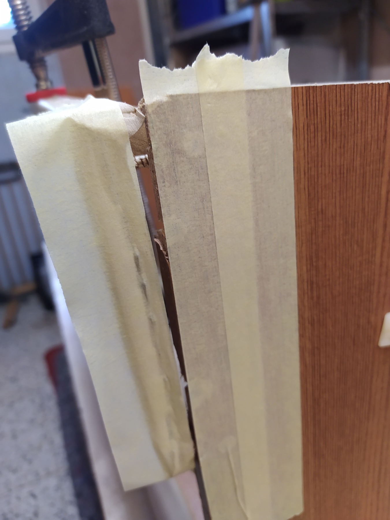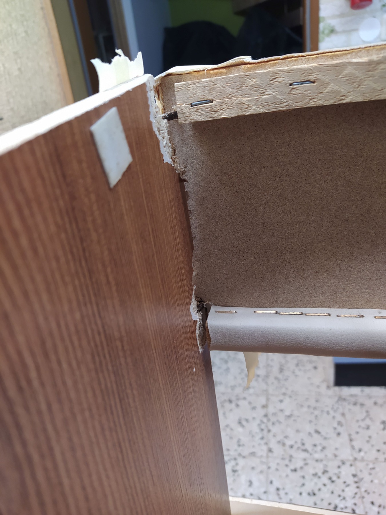 Außerdem haben wir noch den Wiedereinbau der Hängeschränke vorbereitet. Einer der Schränke musste repariert werden, weil er mit den durch die Feuchtigkeit verrosteten Schrauben festgegammelt war und beim Ausbau ausgebrochen ist.