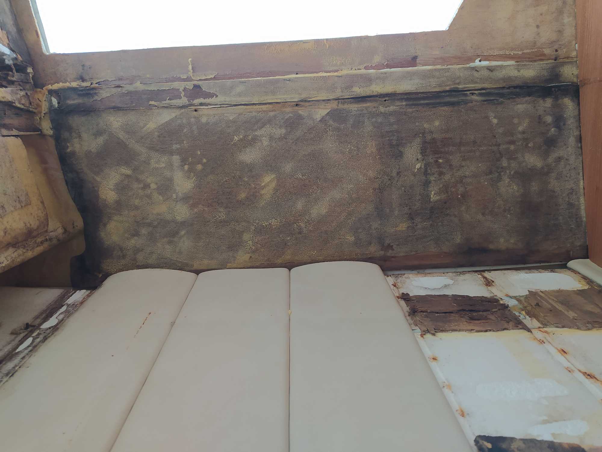 Das Festbett habe ich inkl. Unterbau demontiert. Die Bretter der darunter noch erhaltenen Sitzbank waren alle von innen an den Verschraubungen ausgerissen.