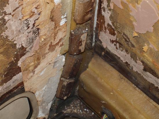 die hinteren Ecken sind wohl ganz interessant, weil es hier keine durchgehende Leiste gibt. dort ist das Hinterteil:laugh: mit Nieten befestigt worden und die stehen über, deshalb hat man wohl immer abwechselnd ein Stück Holz verklebt und die Zwischenräume ausgeschäumt, also gehen auch ein paar Schrauben der äußeren Leiste ins Leere.