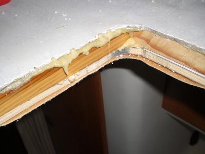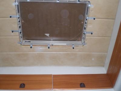 Der Holzrahmen wird eingeklebt. Natürlich mit Caravankleber. Alles schön verpressen und das Dach wird rund um den Ausschnitt gerade. Ich habe vorher eine Höhendifferenz von +/- 1 cm gehabt.
