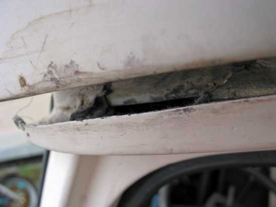 Wie bereits zuvor erwähnt habe/hatte ich auch ähnliche Probleme, die sich trotz mehrfacher Abdichtungsversuche an der Frontscheibe nicht lösen ließen. Ein Versuch hinter die Ursache zu kommen war, wassersaugendes Papier in den Öffnungen der A-Säule zu positionieren, um zu sehen, ob der Wassereintritt von weiter oben kommt, doch jedesmal, nachdem wieder Wasser über den Radkasten lief, war das Papier trocken. Jetzt ist es mir gelungen, ich war zu Hause und es hat geregnet, die Ursache ausfindig zu machen. Nachdem ich zum wiederholten Male die Plastikabdeckung der A-Säule entfernte, hafteten noch zwei bis drei kleine Wasserperlen an der Abdeckung, das Papier in der A-Säle war wie immer trocken. Also musste das Wasser doch von oben kommen und siehe da, das Ende - siehe auch Bild - der Innenauskleidung war nass. Nachdem das Controllpaneel entfernt war, konnte ich auf dem Rest des noch vorhandenen Originaldaches, das ist ein Streifen, der über die gesamte Fensterfront verläuft, ertasten. Dieser Rest war auch verantwortlich dafür, dass das Wasser meistens links (Fahrerseite) aber auch je nach Standort mal rechts (Beifahrerseite) über den Radkasten lief.