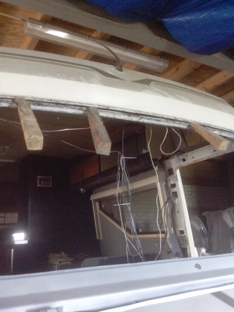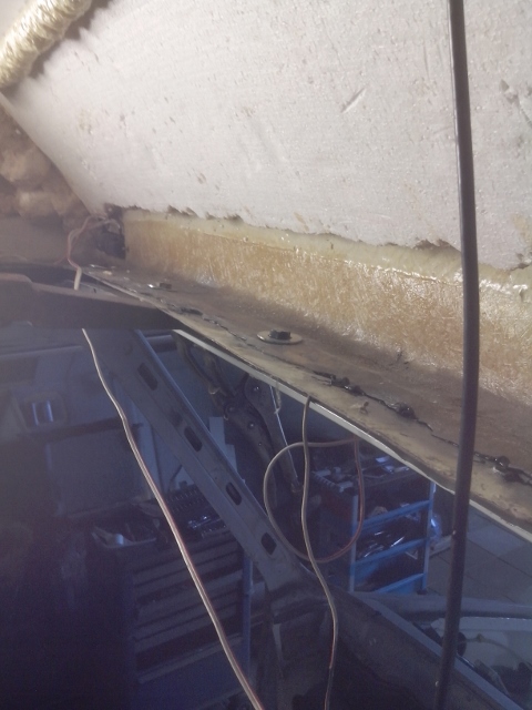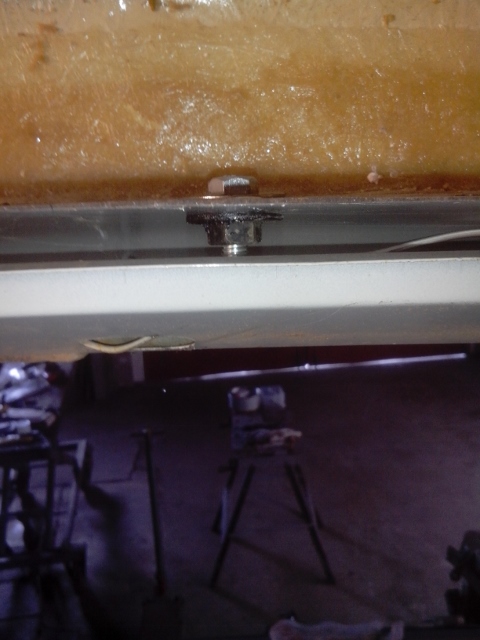 Dan ging es weiter mit spachtel und schmirgelpapier, und dan wen die spachtel trocknete habe ich wie Olli das fahrerhausdach wieder verklebt und verschraubt. das dach habe ich etwas aufgehoben mit holzkeile womit ich etwas raum bekommen habe um das orriginal dachblech mit scleifband zu sauberen, dann mit bremsreiniger gespritzt, und neue kleber da zwissen gespritzt . An die innenseite hätte ich vorher 10 mm locher gebohrt, und nach anbringen des kleber das dachvorderseite mit sieben und die seiten mit zwei R und drei L M10 bolzen mit unterlegscheiben verschraubt.