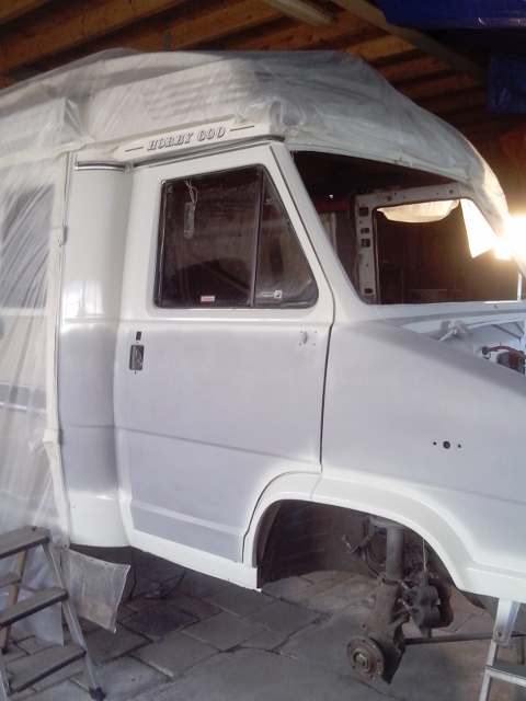jetzt wieder einen kleinen update wie weit ich bin. Nachdas festkleben und schrauben des daches an das orriginal dach, habe ich auch das BCC wieder eingebaut.Auch das bret neben der tür steht wieder wo es gehöhrt. dan war es zeit alles was weiss sein sol neu zu lackieren, damit es dan gut trocken isst wan ich das fahrerhaus wieder einbaue.