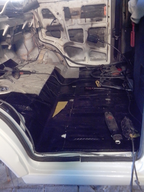 Weil die farbe trocknet hab ich die fahrterhaus boden wieder wie orriginal mit schaldammatten verklebt und darauf noch extra dammmatten aus einen schrotfahrzeug.