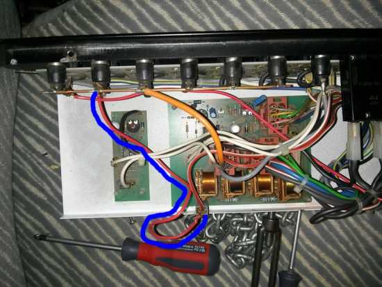 Im Moment steht der Hobby in einer Halle und ist an Landstrom angeschlossen. Auch wenn ich jetzt Verbraucher einschalte, sinkt die Spannung laut Anzeige schon mal auf gute 11V, ohne dass das Ladegerät "anspringt". Als ich das BCC mal ausgebaut habe, fand ich eine etwas abenteuerliche Verkabelung vor (siehe Bild). Es geht vor allem und das rote Kabel, welches ich mit einer blauen Linie in dem Bild markiert habe. Dieses Kabel ist einfach in den unteren Steckel "reingefriemelt" und oben an der großen Drahtbrücke angeschlossen (wo auch das orange Kabel verlötet ist). Jetzt erkennt man ja sofort, dass dieses Kabel absolut amateurhaft installiert wurde und dort nicht hingehört. Nehme ich es aber weg, lässt sich kein einziger Verbraucher mehr einschalten (die Kontrolllämpchen über den Schaltern leuchten dann auch gar nicht).