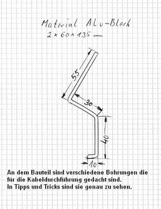 Aus meinem Fundus habe ich ein ALU-Blech 2 x 60 x 135 mm geschnitten und nach dem Plan gebogen.