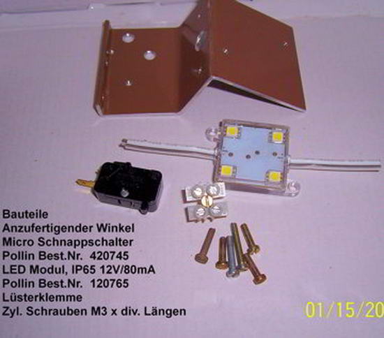 Bei der Firma www.pollin.de habe ich LED Module, Micro-Schnappschalter und Lüsterklemmen besorgt.
