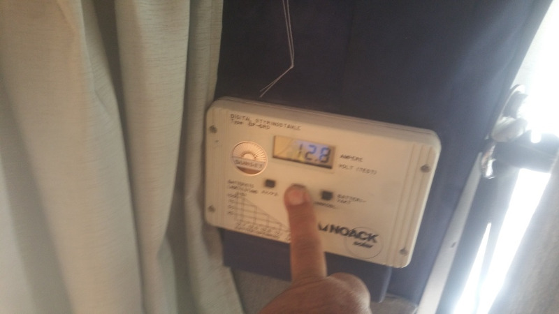 Auf dem Dach ist eine, aus 3 Paneelen ( 33cm X 120cm ) mit je 33 Solarzellen bestehende Solaranlage installiert mit einem Solarregler Noack P6, die immerhin funktioniert. Ich hab schon mal 12,8V und 3,2A abgelesen, das sind immerhin schon 40W. Wie gut der Akku B2 ist weiß ich nicht, das müßte ich mal in der Werkstatt prüfen lassen.