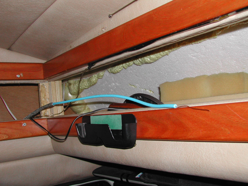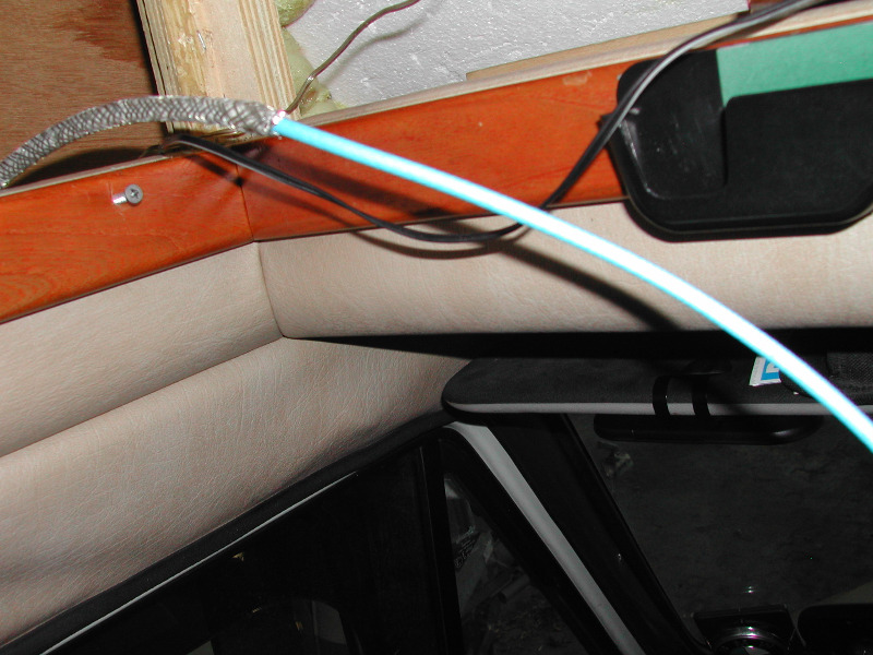 Nach der Demontage der oberen Verkleidung bemerkte ich ein blaues, loses Kabel, das irgendwo aus der Karosserie auf der linken Seite herausragt (die Ansicht ist, als ob die Antenne werkseitig gebaut wäre