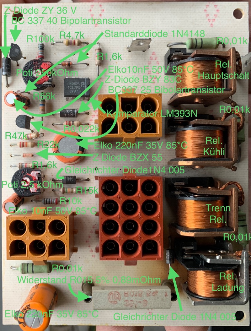 eigentlich brauchst du keine neue Platine. Du brauchst nur das Relais RE4 für den Hauptschalter. Das Lade-Relais (RE1) brauchst du nicht, Kühlschrankrelais (RE3) solltest du in der nähe der Aufbaubatterie montieren, da der Kühlschrank einen eigenen Schalter hat, brauchst du den Schalter oben im BCC nicht. Das Relais für die Parallelschaltung der Aufbau- und Starterbatterie kannst du mit der Kombination LiFePo (Aufbau) und Blei (Starterbatterie) nicht gebrauchen. Wenn die Anzeigen und Schalter im BCC weiter aktiv bleiben sollen, lege die nicht mehr benötigte Kabel "tot" verkabele die Verbraucher neu und baue den "schwarzen Kasten" aus.