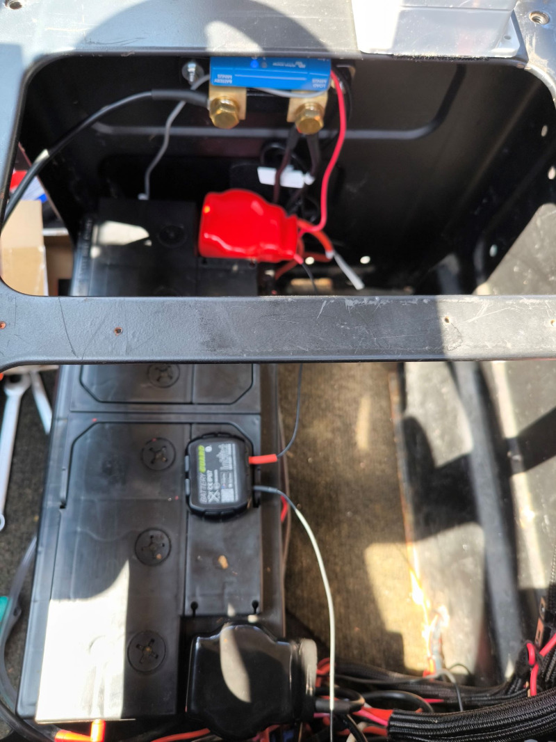 Das orginal Ladegerät im EBL ist wohl abgeklemmt, zumindest wurde der Schukostecker abgekniffen. Dafür war ein Noco Genius GS 15000 mit Schnürsenkel auf dem EBL befestigt und das Pulskabel sowie das Massekabel haben direkten Durchgang und Anschluss zur Aufbaubatterie (hab ich mit Durchgangsmessung geprüft) Das Ladegerät hab ich jetzt durch ein Victron Ladegerät ausgetauscht.