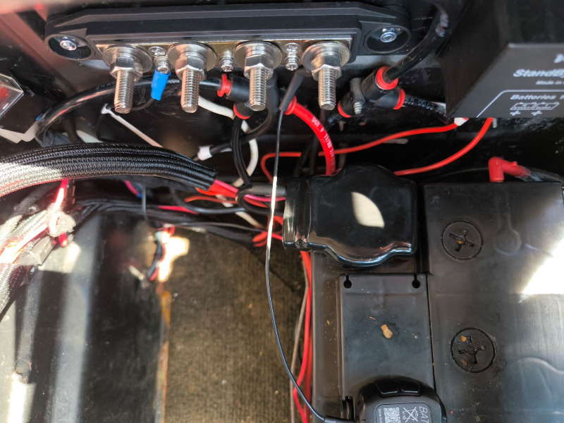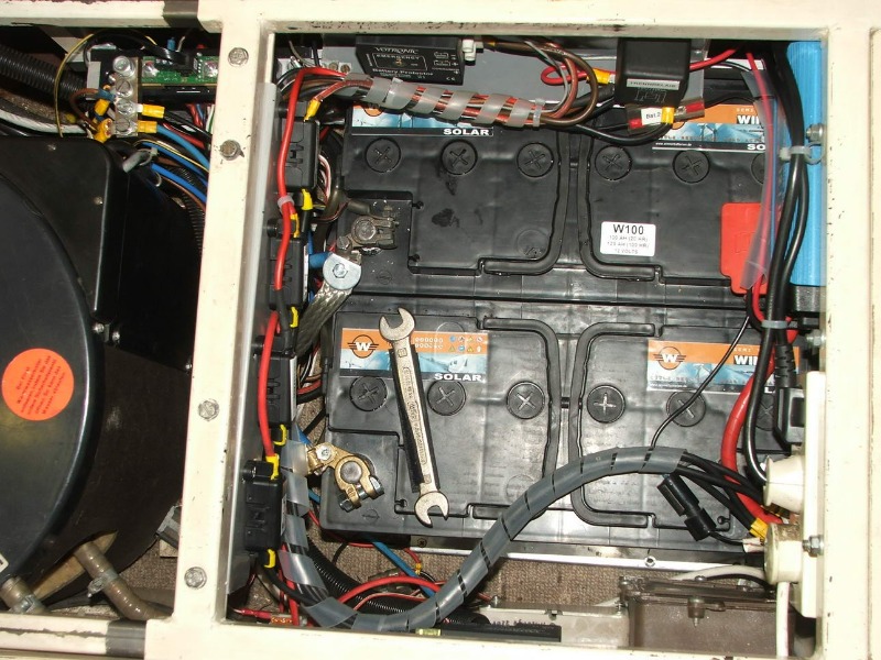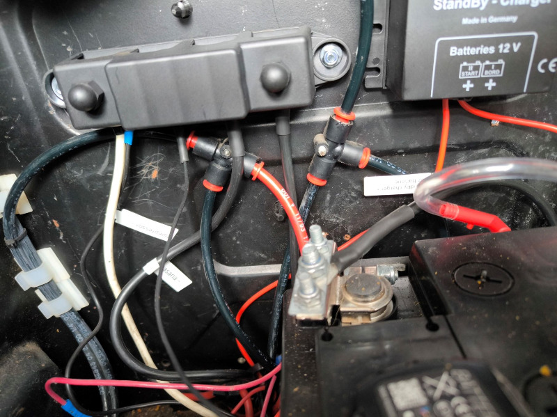 Unter deinem Fahrersitz ist genug Platz für zwei LiFePo4 Batterien in 100 Ah stärke. Gewichtersparniss ist gut 38-40 kilo und von der Leistung her das doppelte da man die AGM oder Blei-Säure zu maximal 50% entladen kann und die Gefahr der Tiefenentladung und damit sind die Batterie schrott, sehr groß. Das passenden Ladegerät für LiFePo4 Batterien kostet um 60-100€ wenn du einen Brauchts. Ich merke jetzt den Unterschied zu AGM Batterien die ich vorher hatte bezüglich der größere Stromentnahme beim Wechselrichter und Klimaanlage. Ehrlich gesagt ich würde einmal den ganzen Kabelsalalat rausschmeißen und neu verkabeln, diesmal gescheit und fest. Statt Sicherung kannst bei Amazon Sicherungsautomaten für kleines Geld besorgen in Stärke die benötigt wird. Vor allem aber den Plus Kabel 10-20 cm direkt nach dem Pluspol mit 120 A Automat absichern. Zwei Batterien-Zwei Sicherungsautomaten. 35-50 Quadrat Kabel falls du später Klimaanlage oder Wechselrichter anschließen willst und du hast dann Ruhe.