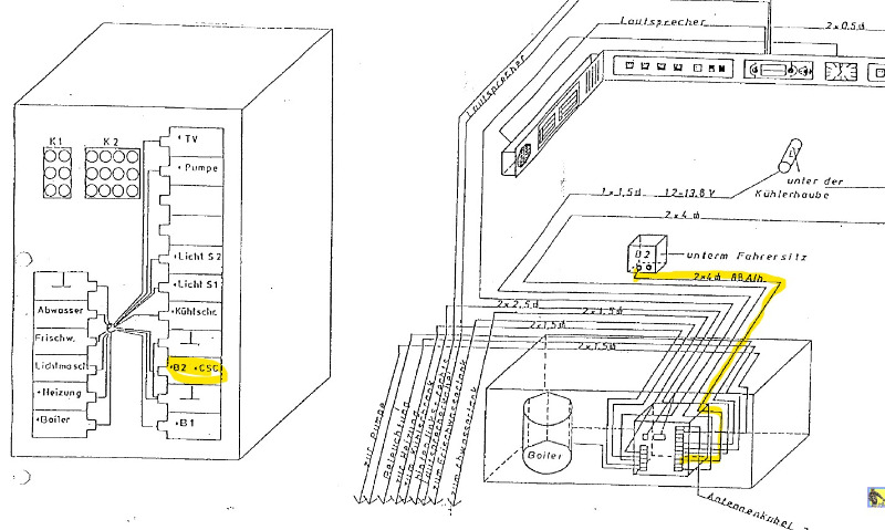 Das sieht jetzt sowiet für mir ordentlich aus, aber was mich wundert ist, das ich kein Kabel von den Zusatzbatterie(n)) zum EBL (B2 +CSC) finde (so wie ich das im Verlegeplan aus dem Download Bereich zu erkenne glaube) Ich habe soweit alles gefunden und beschriftet. Aber das Kabel ist nicht an den Batterien da, obwohl auf 12 Volt Licht, Kühlschrank etc funktioninieren (abgesehen von den Anzeigen Frisch/Abwasser, Volt/A-Meter und Uhr.