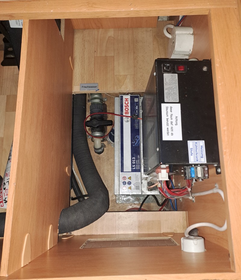Das alte BCC mit allen Relais findet sich auf einer Platine unter dem Ladegerät. Die Aufbaubatterie BOSCH 90Ah Naß sitzt unterhalb des Ladegeräts;