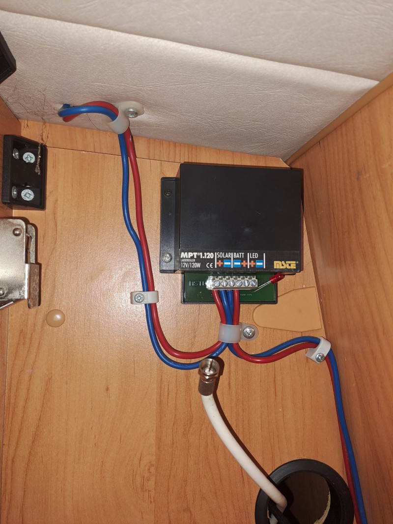 der Solarregler befindet sich unsinnigerweise im Oberschrank der hinteren Sitzbank; der FI-Schalter wurde von Hobby, warum auch immer, in der Rückwand der vorderen Sitzbank platziert. Also möglichst weit weg von der Landstromsteckdose ?!
