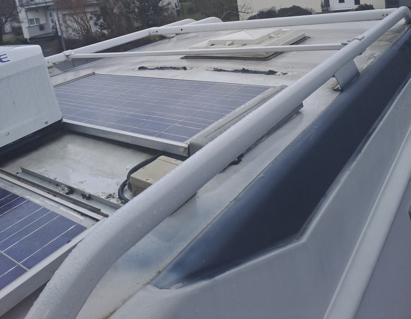 Die Solaranlage wird "ergänzt" durch eine 2. direkt hinter der Klimaanlage mit 2x275W. Dafür müssen beide vorhandenen Module beidseits der Klimaanlage direkt anschließend an die neuen nach vorn verlegt werden. Deren alter Regler wandert mit neuer Verkabelung ins Elektroabteil.