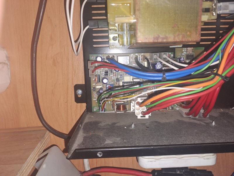 Das alte Ladegerät wird ausgebaut, die BCC-Platine und die Klemmleisten (modernisiert) kommen an anderer Stelle ins Elektroabteil. An die Stelle des alten Ladegeräts kommt ein Votronic VBCS 60/40/430 Triple Kombigerät; das erspart mir viel Arbeit bei höherer Leistung und geringeren Kosten.
