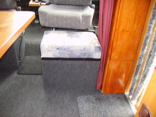 Ich habe mir eine kleine Getränkekiste für die Bettverlängerung gebaut, die bei Nichtgebrauch hinter dem Beifahrersitz steht.