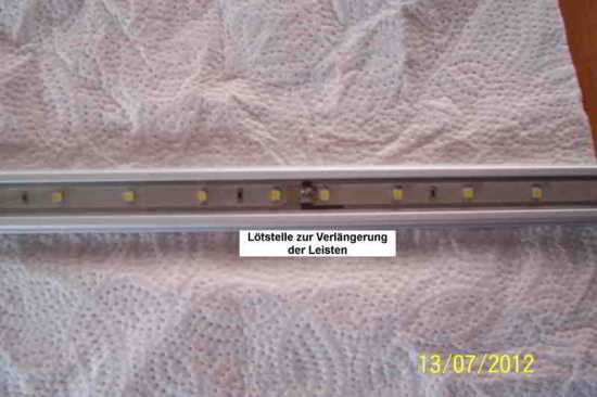 Ein Set(Art.Nr.172825)2 Stück 9,99 €. Die habe ich auseinandergenommen, das heisst aus der Plastikschiene gelöst um nur die Led-Leisten zu bekommen. Es ist ganz einfach, man muss nur die kleine Plastikniete am Anschluss durchschneiden und kann die Leds herausziehen. Die Leisten habe ich dann hintereinander verlötet, bis auf die benötigte Länge von 1,5 m. Ein Leiste habe ich um 3 Leds verkürzt.