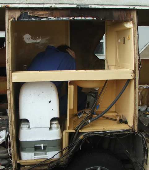 die "Nasszelle" ist eine Einheit. Wenn Du die Wand demontieren willst, dann musst Du von innen die Kunststoffverkleidungen entfernen (sind getackert und geklebt). Dahinter sind die Holzplatten mit Metallwinkeln verschraubt. ... Du kannst es aber auch so machen: