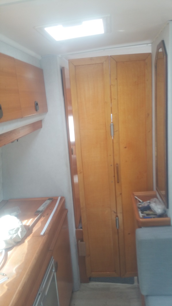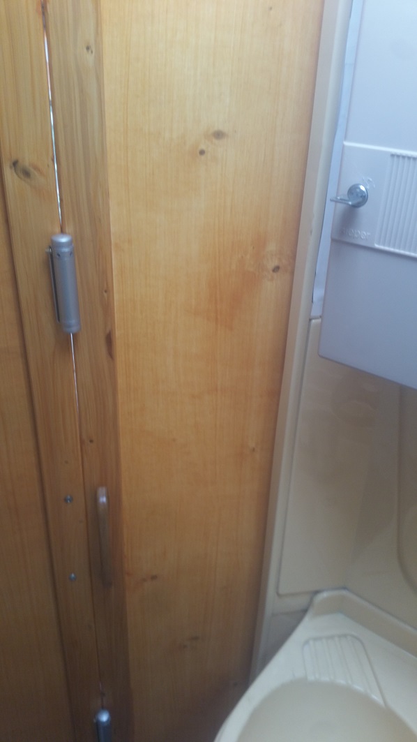 einer meiner Vorbesitzer hat das Festbett sehr breit gebaut und auf 40 cm höher gelegt. Die Folge davon ist das es recht kompliziert geworden ist, die Tür zum WC zu öffnen und rein zu gehen. Besonders meine Frau hat dabei Probleme da sie seit einem Schlaganfall links etwas gehandicapt ist.