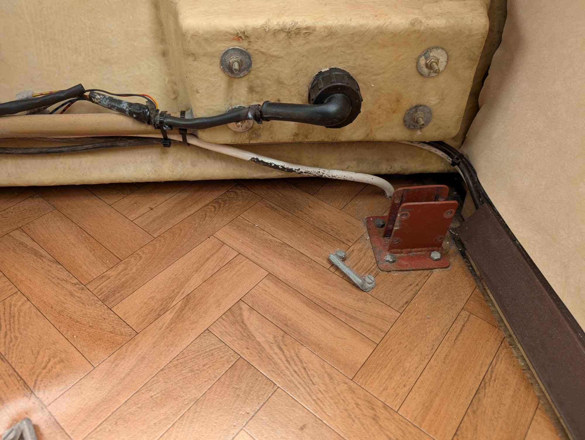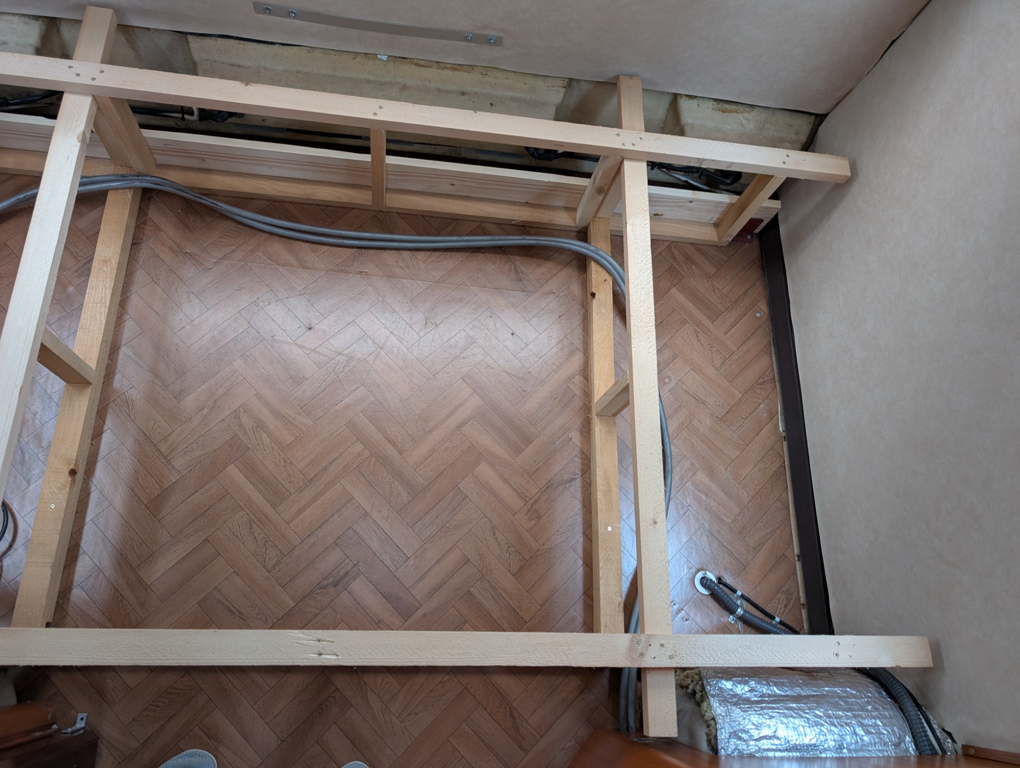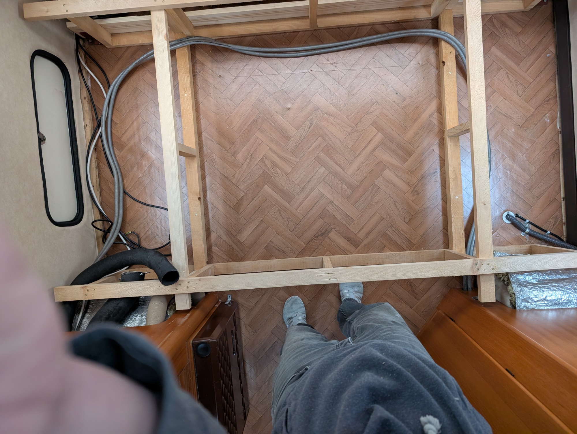 Weil ich möglichst viel von dem wie es im Original gewesen ist erhalten und keine neuen Löcher in den Boden von Frau Müller bohren möchte, haben wir den Unterbau an den Haltern, an denen das Bett auch schon vom Vorbesitzer verschraubt wurde, befestigt. Die Halter sind durch den Boden geschraubt und bieten, unserer Meinung nach einen sehr guten Halt.