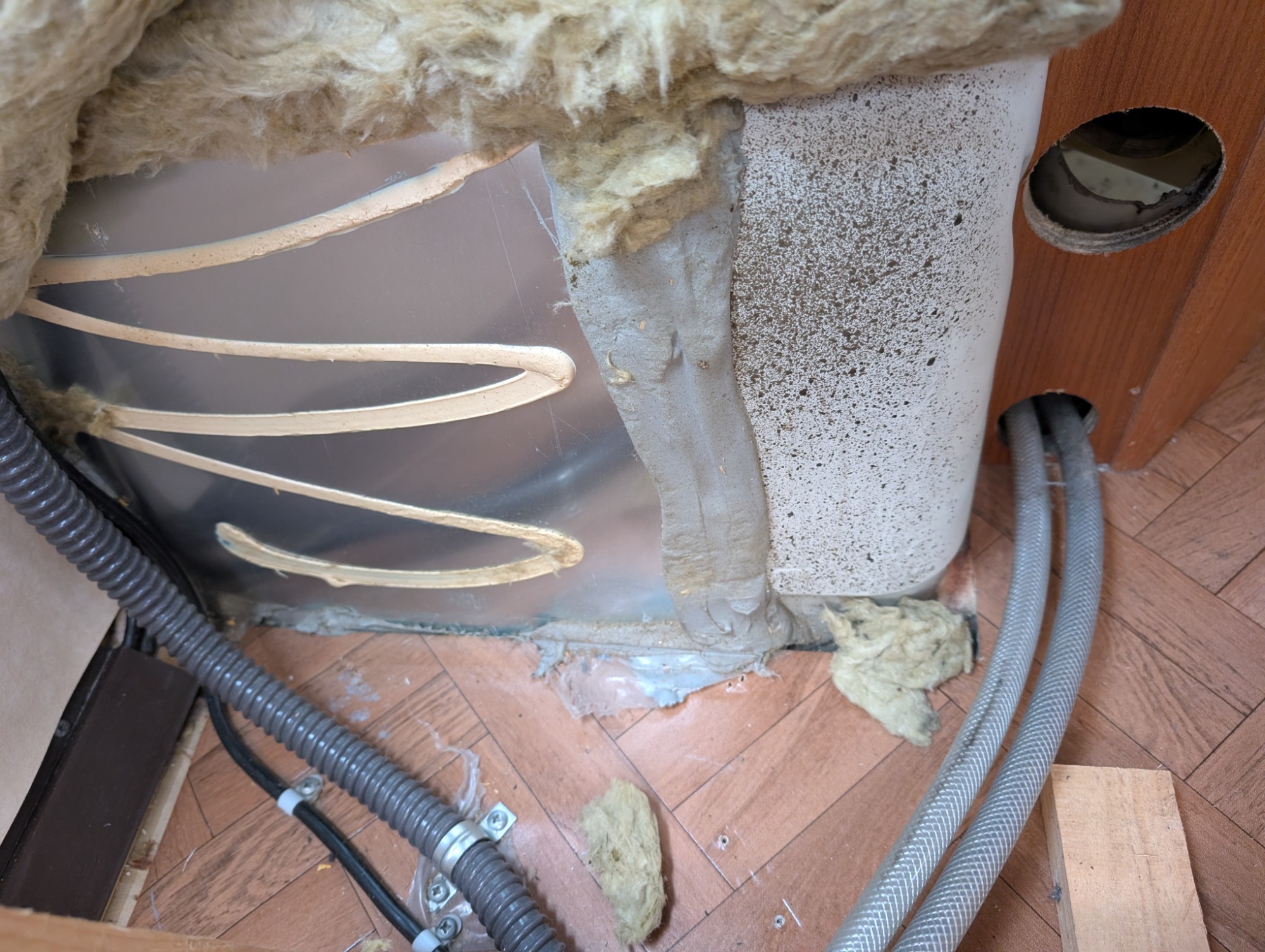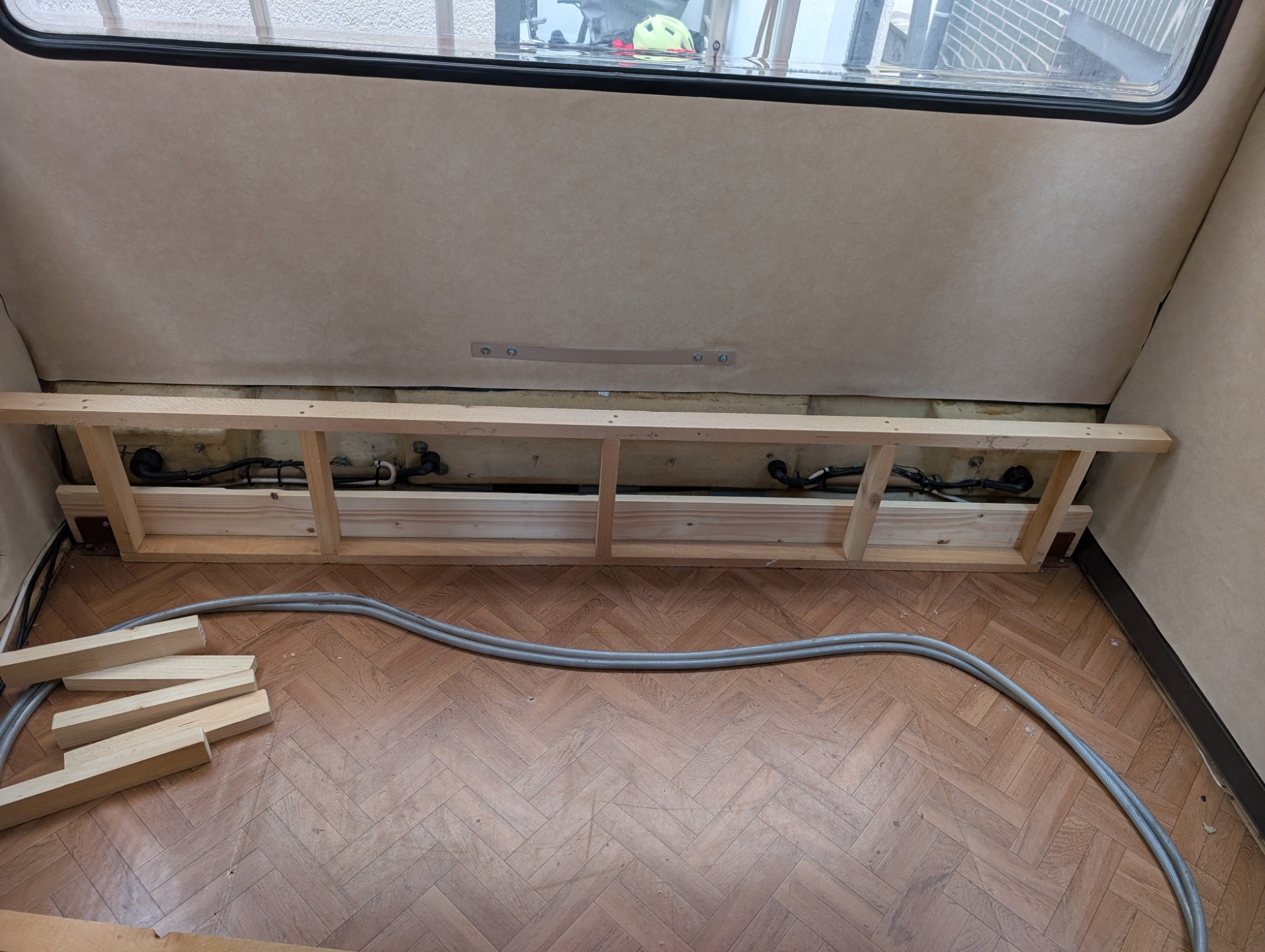Von vorn kommt auf dieses Gerüst noch eine Sperrholzplatte und der Raum dahinter wird mit Schafswolle gedämmt, um möglichst keine Feuchtigkeit durch eine Kältebrücke zu erzeugen. Die Schafwolle bekomme ich von den Schafen einer Klassenkameradin.