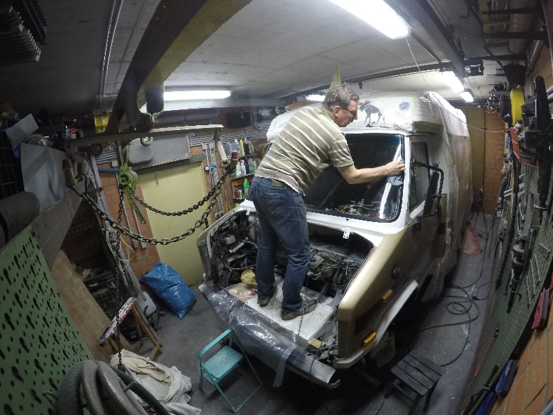 langsam geht es voran. Nachdem in den letzten Tagen überwiegend Kleinkram erledigt wurde, war heute ein besonderer Tag. Die Windschutzscheibe ist wieder eingebaut und mit Dekalin versiegelt.