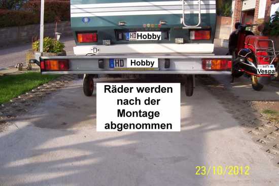 Da ich den Träger allein wechseln oder anbauen muß, habe ich mir zwei Gummiräder als Hilfsmittel angebracht. Nun kann ich den Träger ohne Kraftaufwand montieren.